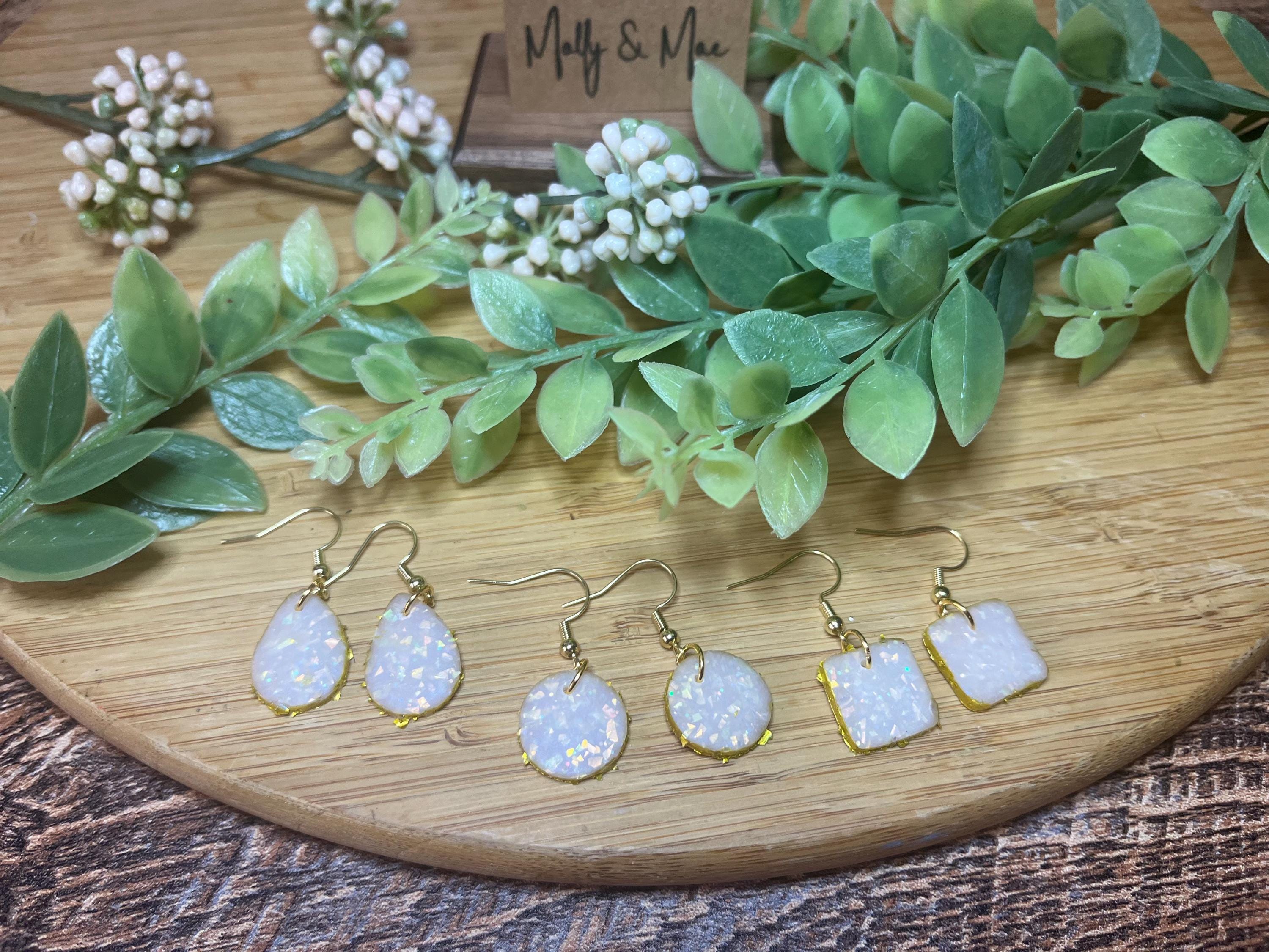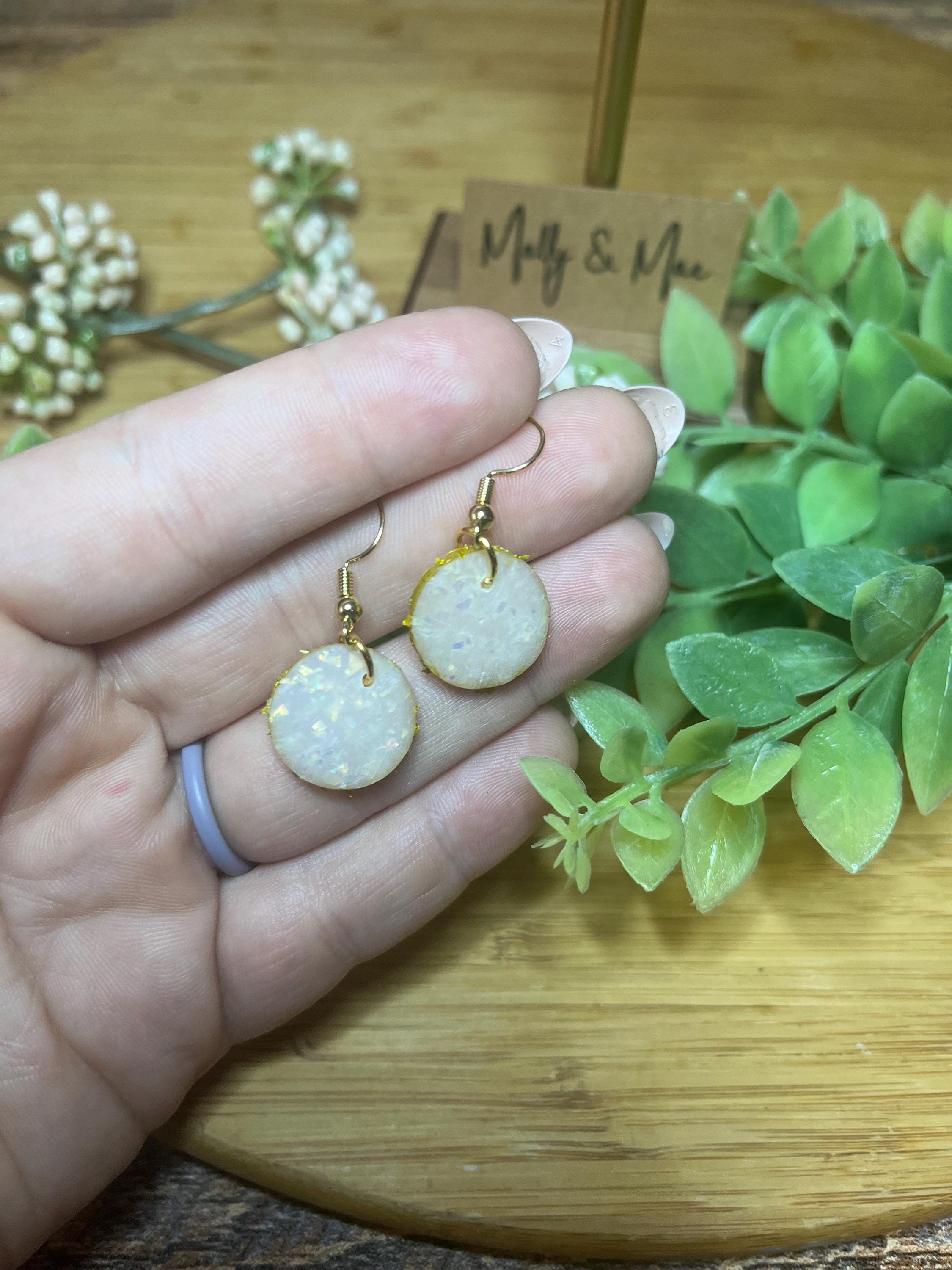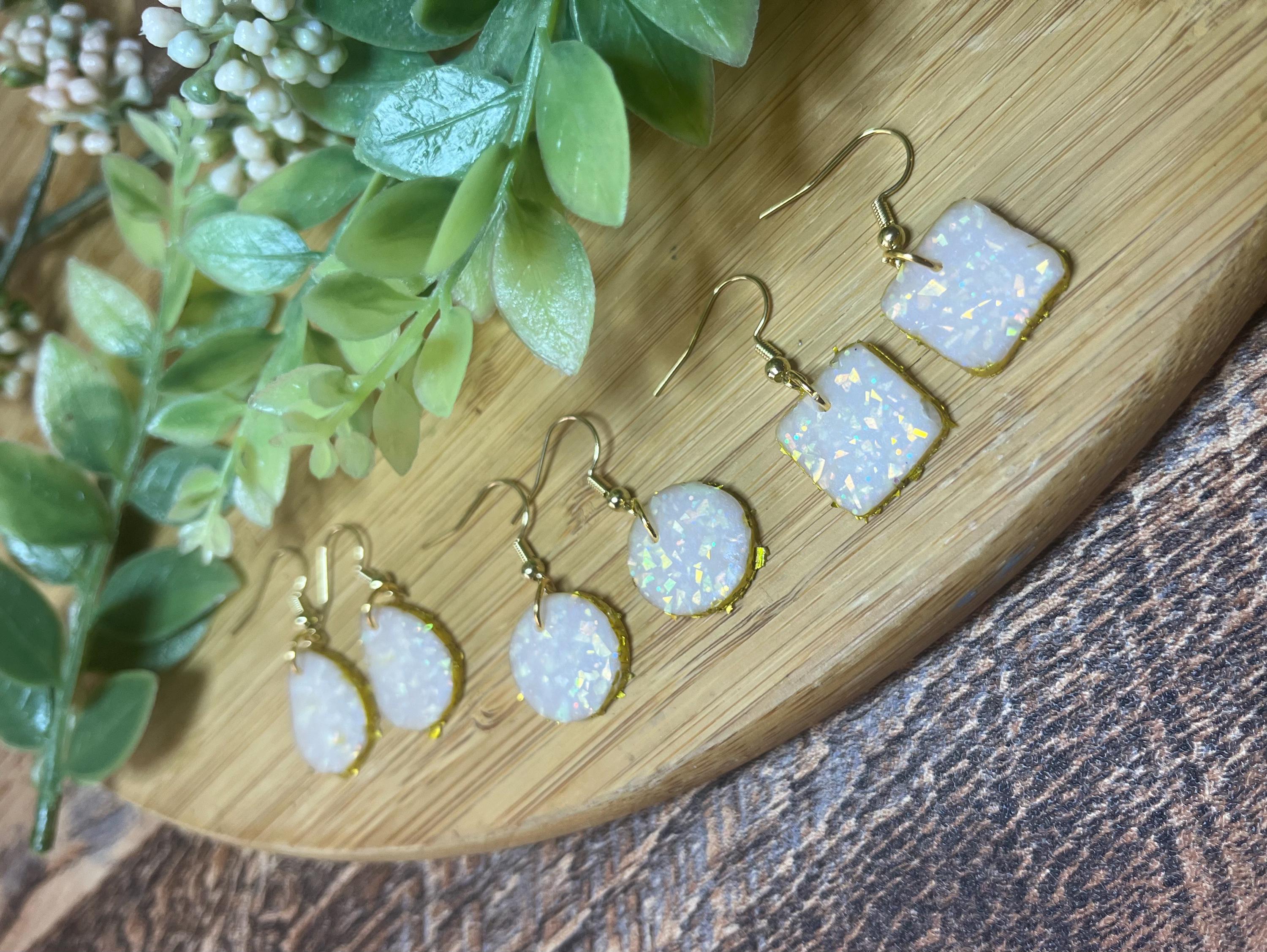 The pink opal dangle earring is made from opal polymer clay that will shimmer beautifully in any light! The Polymer clay dangle is elegantly boarded with a gold trim border and hang gracefully from a matching gold hook.