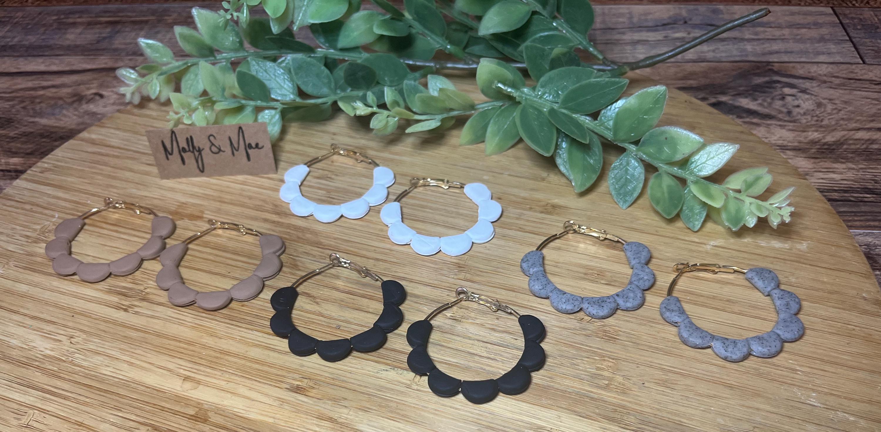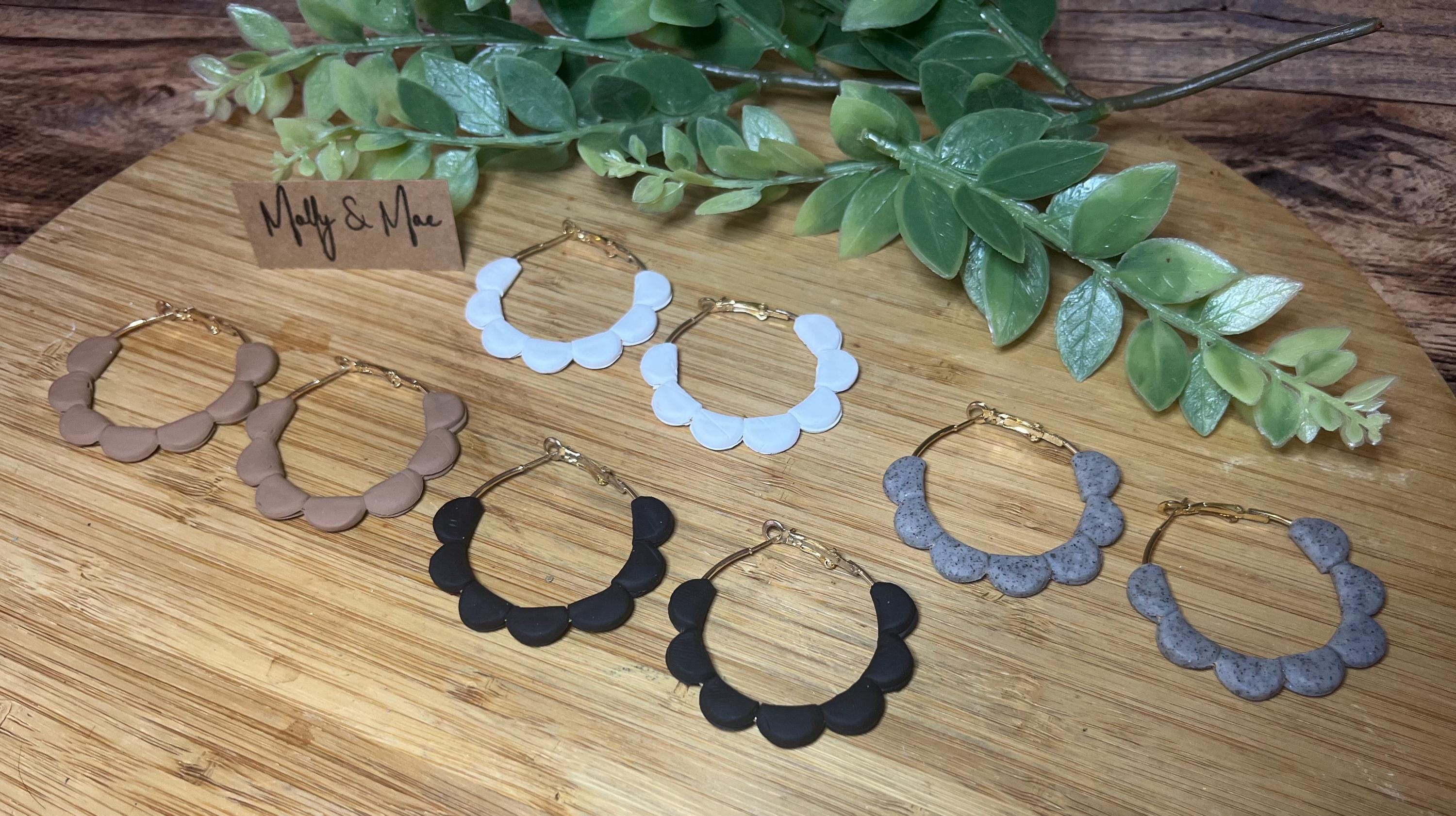 Discover the elegance of the Scallop Hoop Earrings - a stunning blend of modern sophistication and timeless design. These earrings feature a gracefully curved scallop shape, meticulously crafted to evoke serene movement. The Gold or Silver hoops are adorned with shades of tan, white, stone gray, or black, perfectly accentuation their elegant form.