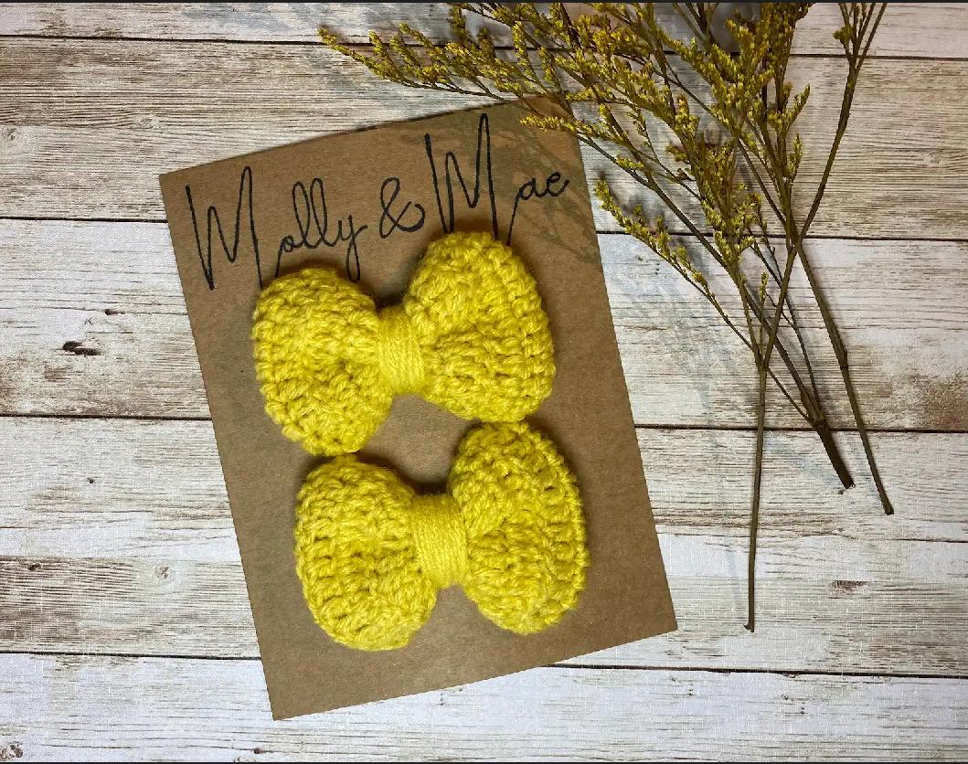 Embrace timeless elegance with these handcrafted crocheted yellow bows! Meticulously crafted with soft, high-quality acrylic yarn, on a silver metal alligator clip, or Nylon Headband these bows offer a charming and versatile accessory for any occasion. Perfect for adding a pop of color to your hair! Or get creative and add them to your clothing, or even as a delightful embellishment on a gift! These bows can be both stylish & functional.