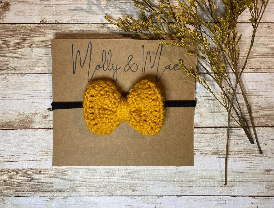 Embrace timeless elegance with these handcrafted crocheted mustard yellow bows! Meticulously crafted with soft, high-quality acrylic yarn, on a silver metal alligator clip, or Nylon Headband these bows offer a charming and versatile accessory for any occasion. Perfect for adding a pop of color to your hair! Or get creative and add them to your clothing, or even as a delightful embellishment on a gift! These bows can be both stylish & functional.