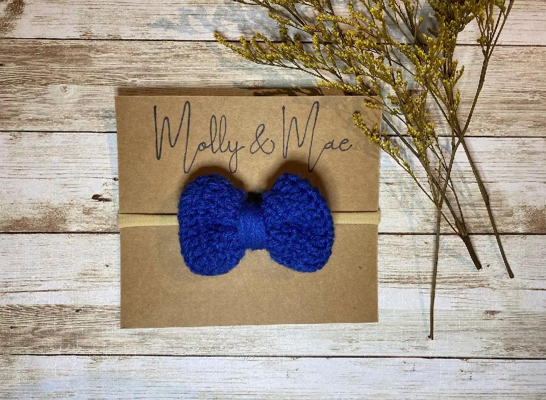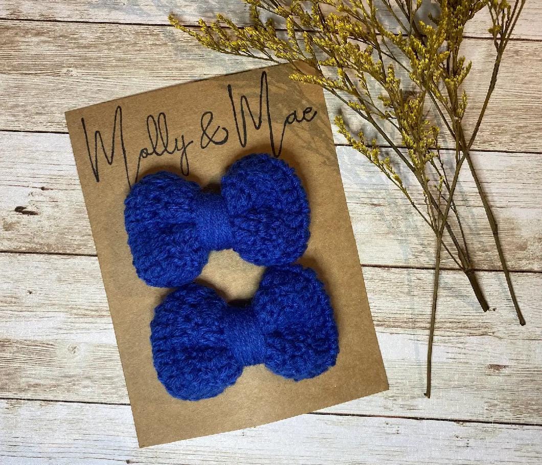 Embrace timeless elegance with these handcrafted crocheted navy blue bows! Meticulously crafted with soft, high-quality acrylic yarn, on a silver metal alligator clip, or Nylon Headband these bows offer a charming and versatile accessory for any occasion. Perfect for adding a pop of color to your hair! Or get creative and add them to your clothing, or even as a delightful embellishment on a gift! These bows can be both stylish & functional.
