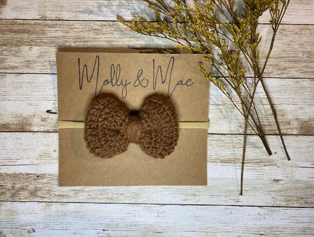 Embrace timeless elegance with these handcrafted crocheted brown bows! Meticulously crafted with soft, high-quality acrylic yarn, on a silver metal alligator clip, or Nylon Headband these bows offer a charming and versatile accessory for any occasion. Perfect for adding a pop of color to your hair! Or get creative and add them to your clothing, or even as a delightful embellishment on a gift! These bows can be both stylish & functional.