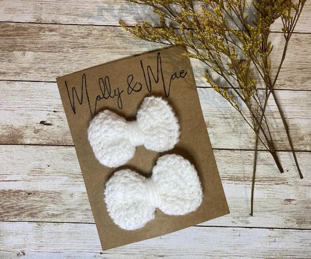 Embrace timeless elegance with these handcrafted crocheted white bows! Meticulously crafted with soft, high-quality acrylic yarn, on a silver metal alligator clip, or Nylon Headband these bows offer a charming and versatile accessory for any occasion. Perfect for adding a pop of color to your hair! Or get creative and add them to your clothing, or even as a delightful embellishment on a gift! These bows can be both stylish & functional.