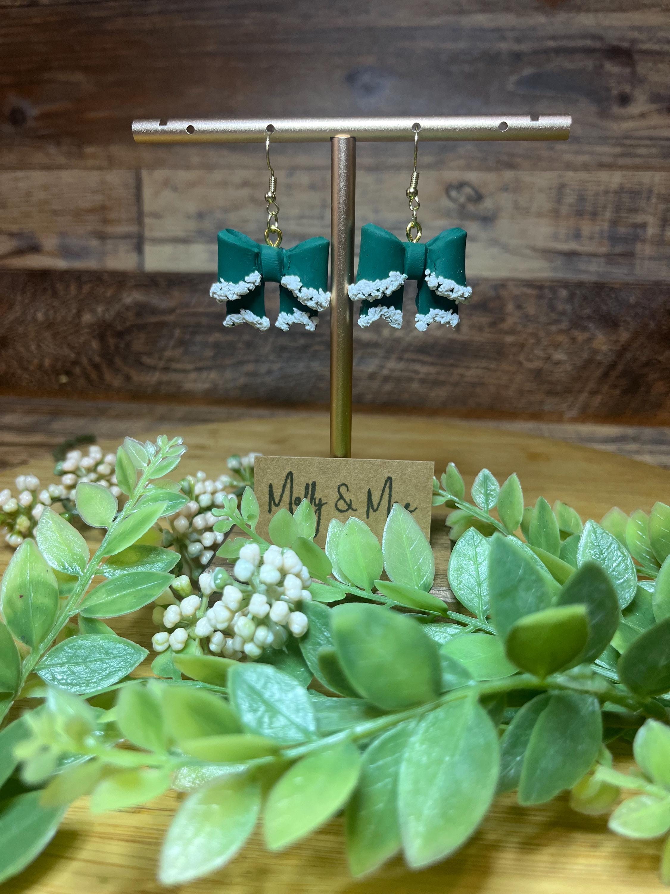 Add a touch of elegance to your jewelry collection with these charming bow earrings. These earrings feature a graceful dangle and delicate white flocked snow trim that enhances the beautiful red or green bows, creating a delightful contrast.