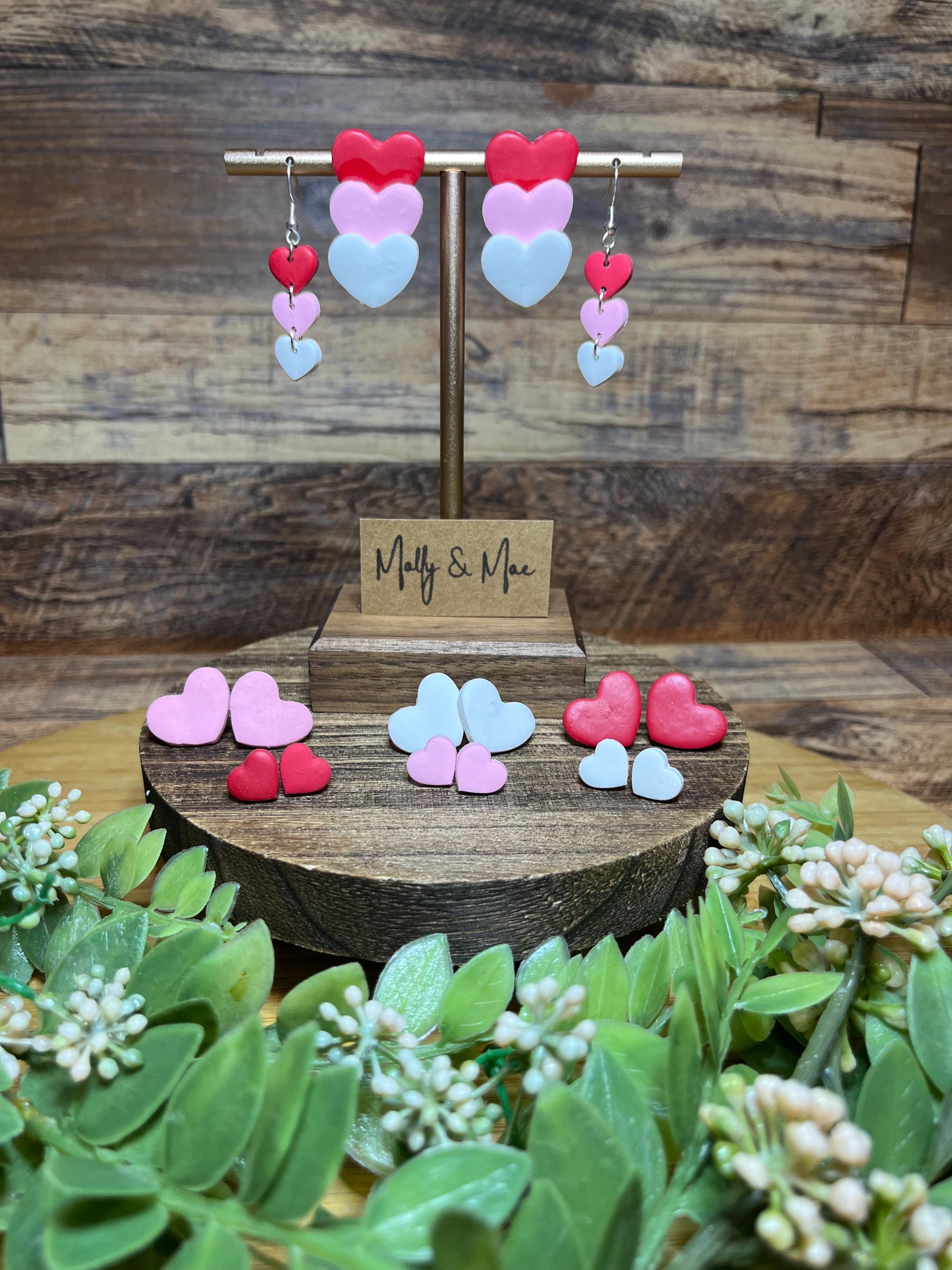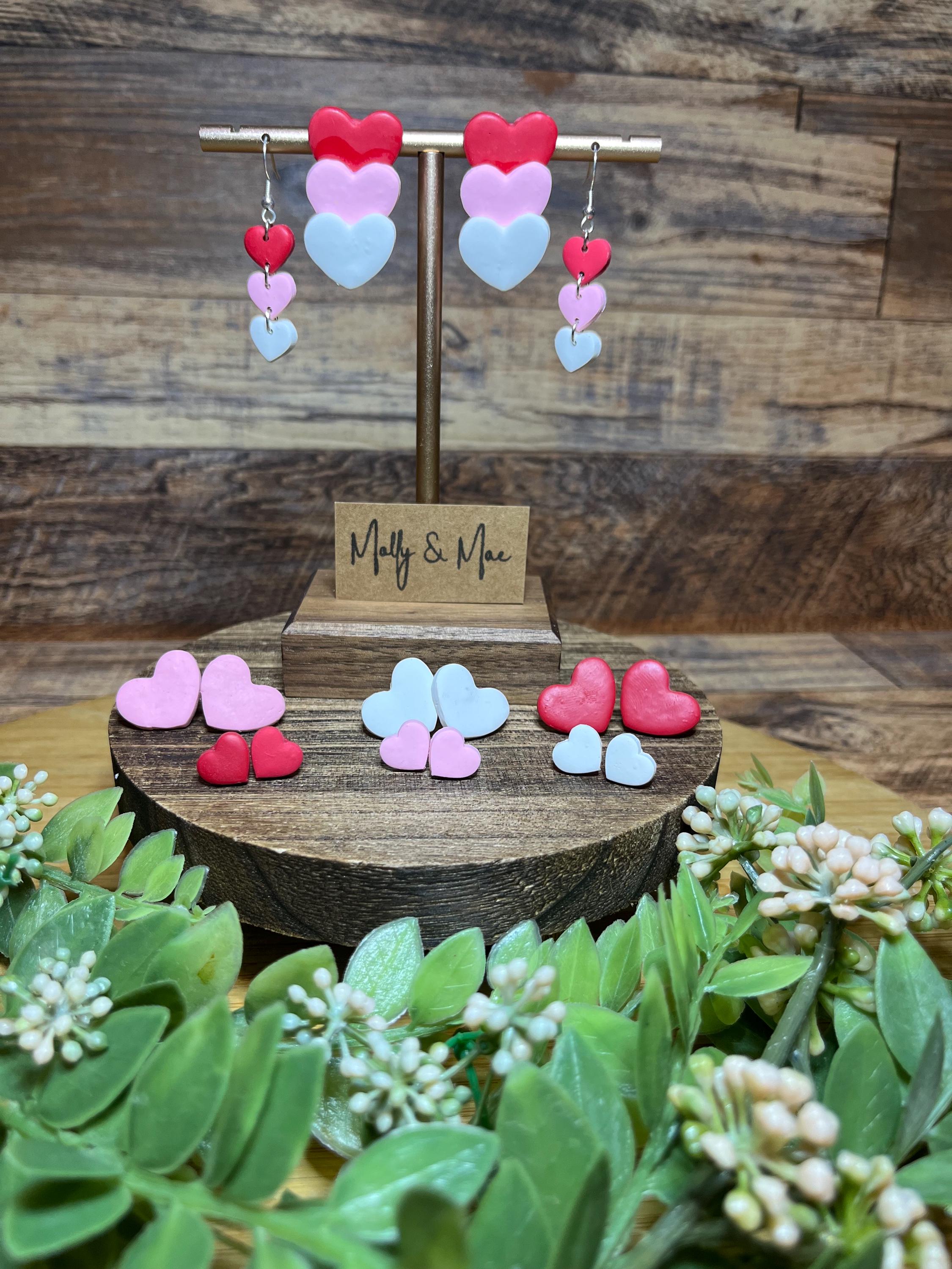 1. Heart Dangle Earrings: Each earring elegantly features three delightful hearts in vibrant red, soft pink, and calming white, artfully stacked to create a charming dangle effect. These earrings are designed to sway gracefully with your every move.